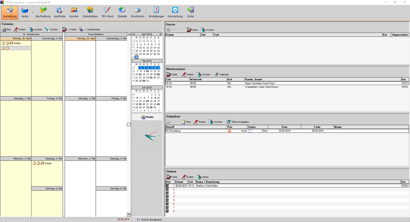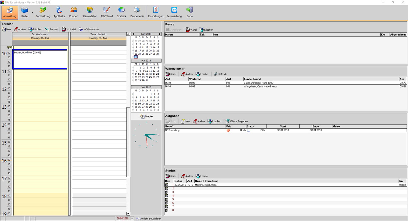 In der Anmelde-Übersicht werden Termine, Aufgaben, abzurechnende Kasseneinträge und Stationskäfige übersichtlich angezeigt.