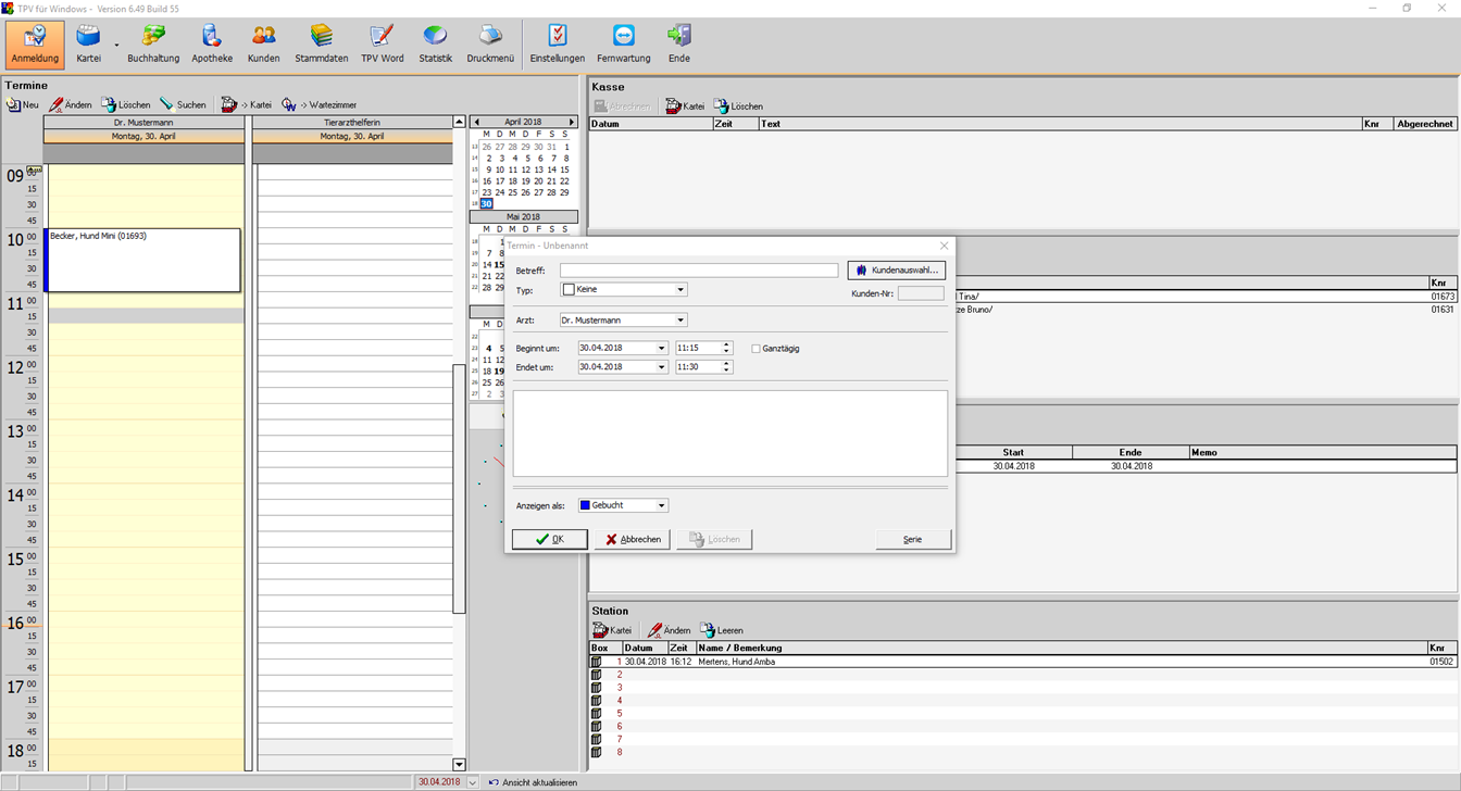 - Mit dem Terminkalender von TPV für Windows verwalten Sie in einfacher und übersichtlicher Form alle Termine und Ressourcen in Ihrer Praxis bzw. Klinik. Durch die Netzwerkfähigkeit ist die Terminplanung nicht mehr auf das Terminbuch alleine beschränkt, sondern jeder Arbeitsplatz hat jederzeit einen Überblick über alle Termine. Die farbig hervorgehobene Kennzeichnung der Sprechzeiten trägt zusätzlich zur Übersichtlichkeit bei. Ebenso können Sie Termine in Serie anlegen. Jahres- sowie Geburtstage werden so nie mehr vergessen. Eine selektive Darstellung in Tages- Wochen- und Monatsansichten, ist möglich. Verschiedene Termintypen können mit unterschiedlichen Farben erfasst werden. Durch einen Mausklick können Sie direkt von einem Termin in die entsprechende Karteikarte springen. Mit der Volltextsuche finden Sie jeden Termin in kürzester Zeit. Der Kalender kann ebenfalls mit Ihrem mobilen Endgerät synchronisiert werden.