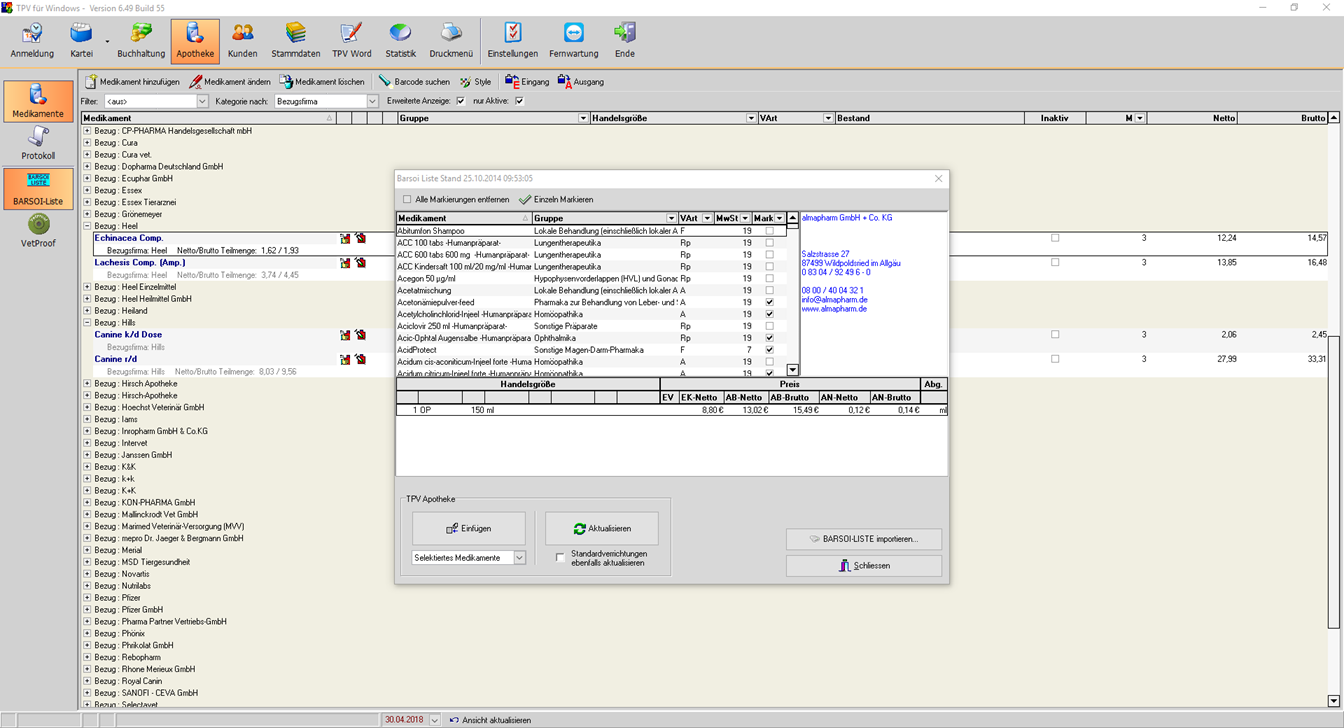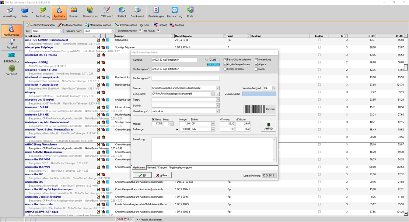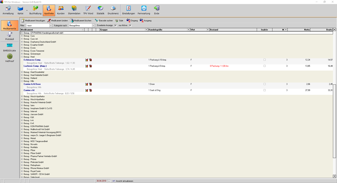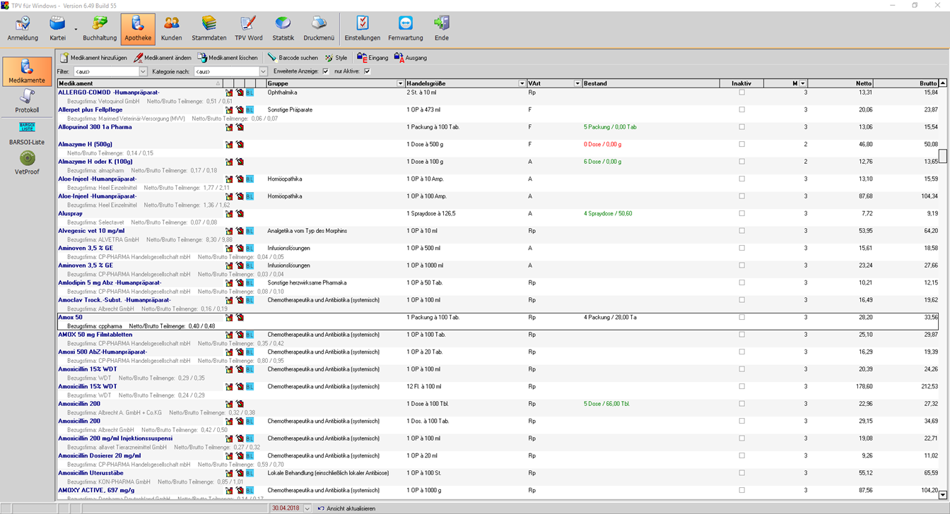 In der Apotheke werden die Medikamente für die Anwendung und Abgabe verwaltet. Hier legen Sie die Handelsgrößen mit Preisen fest. Die Berechnung der Verkaufspreise nach AMPVO erfolgt auf Wunsch automatisch. Für den regelmäßigen Abgleich Ihrer Medikamente können Sie die Daten der Barsoi-Liste® nutzten. Die Schnittstelle ist Bestandteil von TPV für Windows. Die Medikamenten-Bestandsverwaltung gehört ebenfalls zum Umfang der Apotheke. Die Medikamente können kategorisiert bzw. gefiltert angezeigt und durchsucht werden. So haben Sie die Möglichkeit Medikamente direkt zu vergleichen und sich einen Überblick über alle Medikamente von einem bestimmten Hersteller zu verschaffen. Listen nach Anbietern und Mindest-bestand bilden wichtige Instrumente zur Führung einer wirtschaftlichen Apotheke. Protokolllisten wie auch die BTM-Liste liefern Daten über den Verbrauch und Verbleib von Medikamenten. TPV für Windows bilanziert Ihre Apotheke nach den neuen Bestimmungen von § 13 Absatz 4 der TÄHAV. Eine wichtige Funktion im Großtierbereich ist der Medikamenten Anwendungs- und Abgabebeleg. Dieser wird im Rahmen der Behandlungserfassung weitestgehend automatisch erstellt und kann dann sofort oder zu einem späteren Zeitpunkt ausgedruckt werden. Ein Bestandsbuch-Vordruck für den Tierbesitzer kann zusätzlich ausgedruckt werden. Mit Hilfe der QS-Schnittstelle übermitteln Sie die Arzneimittel-Einsatzdaten direkt online an das staatliche Qualitätsmanagementsystem. Die Umwidmung von Medikamenten (Therapienotstand) gemäß § 56a, Abs. 2 des Arzneimittelgesetzes (AMG) wird ebenfalls unterstützt. Weiter zur Funktion Kundenverwaltung... |