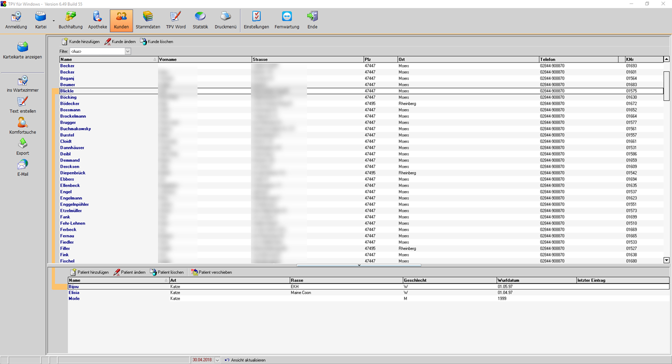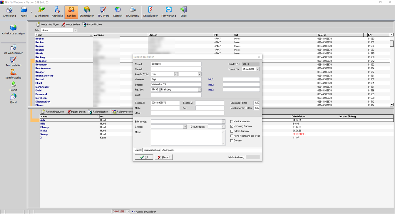 In der Kundenverwaltung werden alle Daten zu den Kunden erfasst und gepflegt. Es können beliebig viele Patienten zu einem Kunden erfasst werden. Die Suche eines Kunden erfolgt inkrementell durch Eingabe der Anfangsbuchstaben des Namens. Mit der Komfortsuche finden Sie jeden Kunden bzw. Patienten. Dabei können Sie mehrere Suchkriterien wie Tiernamen, Rasse und Kundendaten kombinieren. Auf Knopfdruck wechseln Sie in die jeweilige Kartei, erstellen einen Wartezimmereintrag, einen Brief oder eine E-Mail. Ein Halterwechsel von Patienten ist jederzeit möglich. Weiter zur Funktion Stammdaten... |